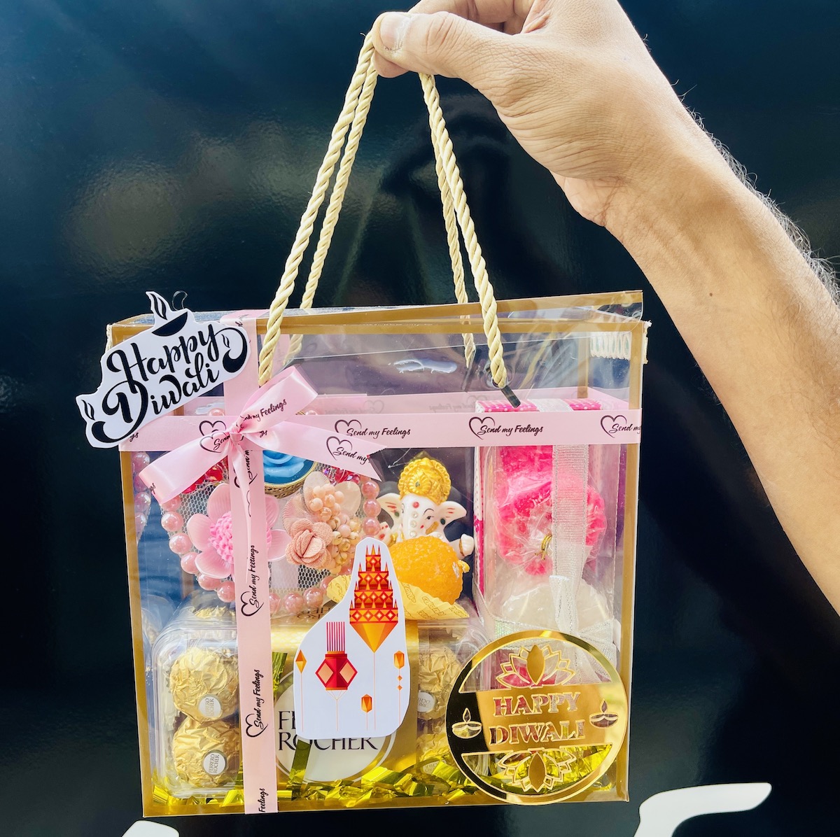 Packed in a premium transparent carry bag with golden handles & pink Send My Feelings ribbon