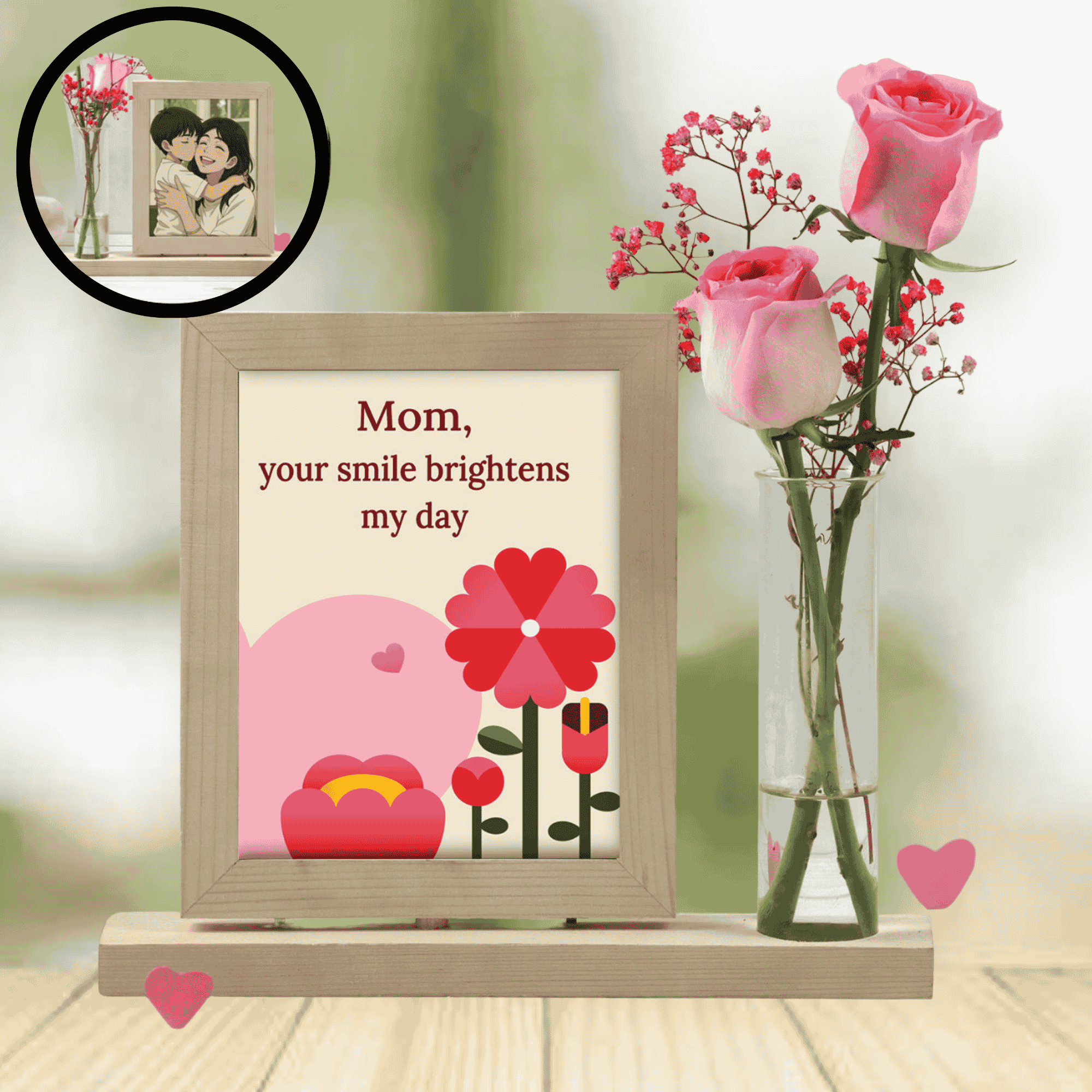 Celebrate cherished moments with our Blooming Memories Frame — a beautifully crafted MDF & wooden photo frame that holds your favorite 4 x 6 inch photo. Accented with a sleek test tube and delicate aqua pink roses, this frame brings a floral charm to any space, making it a perfect personalized gift for special occasions.