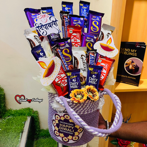 Jute basket includes 4 Dairy Milk Silk (60 g), 3 KitKat (25 g), 2 Snickers (20 g), 3 Galaxy (45 g), and 8 Dairy Milk (13 g), beautifully decorated with Diwali tags, cutouts, and artificial flowers.