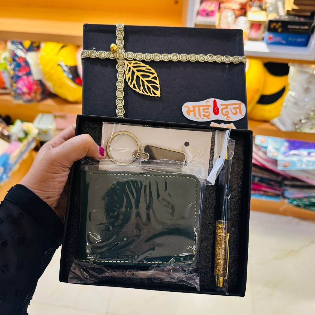 The Classic Bhai Dooj Men’s Gift Box features a sleek leather wallet, a classy keychain, and a luxury pen — all neatly packed in an elegant festive box. A perfect blend of practicality and love, this set is sure to make your brother feel special and appreciated. 💝