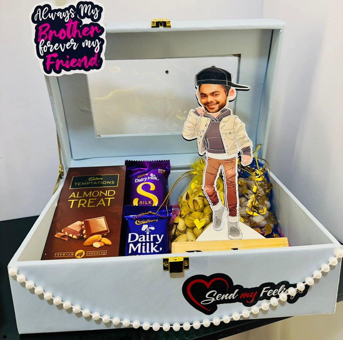 This Bhai Dooj, surprise your brother with our My Rockstar Brother Bhai Dooj Gift Box — a mix of sweetness, style, and sentiment! 💫 Featuring rich chocolates, premium dry fruits, and a fun personalized figurine, this gift captures your love in the most creative way. Wrapped beautifully in a pearl-adorned box, it’s a keepsake he’ll treasure long after the chocolates are gone. A perfect token to celebrate your forever bond with your rockstar brother! 💙✨